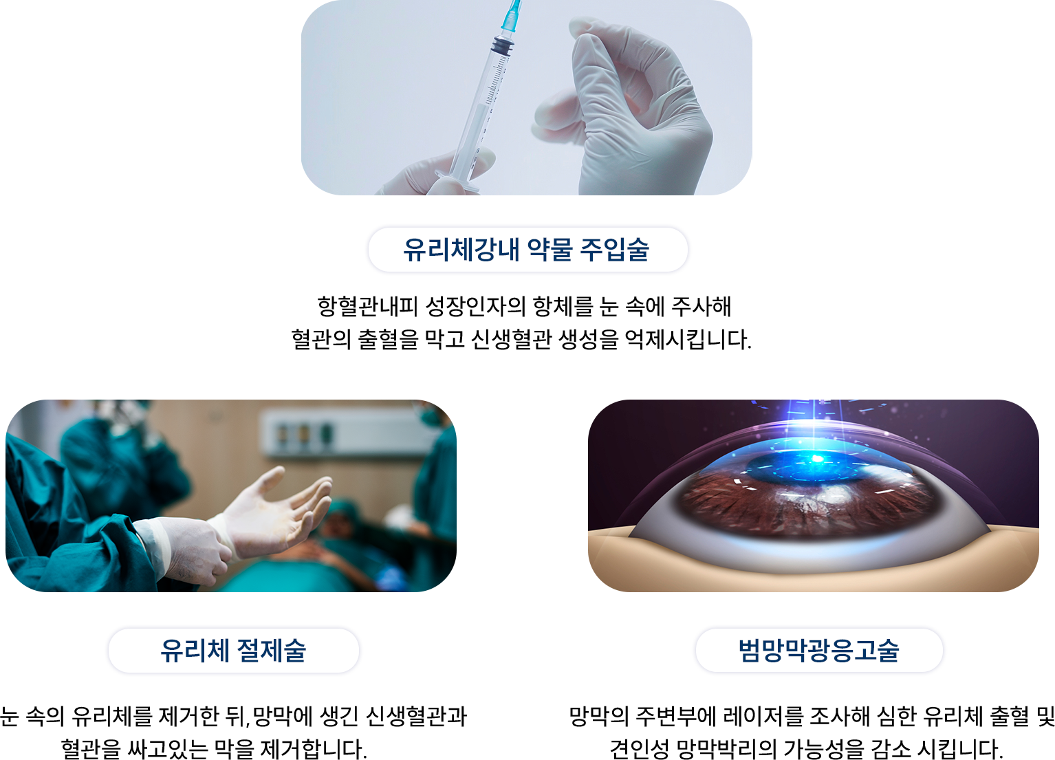 망막의 주변부에 레이저를 조사해 심한 유리체 출혈 및 견인성 망막박리의 가능성을 감소 시킵니다.