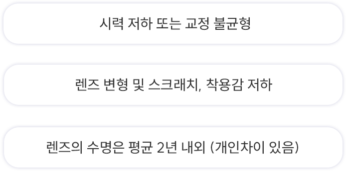 알러지나 비염 등 개인의 눈상태에 따라 렌즈에 침착물이 생길 수 있으며 스크래치, 변형, 파손 등이 발생할 수 있어 철저한 관리가 필요합니다.